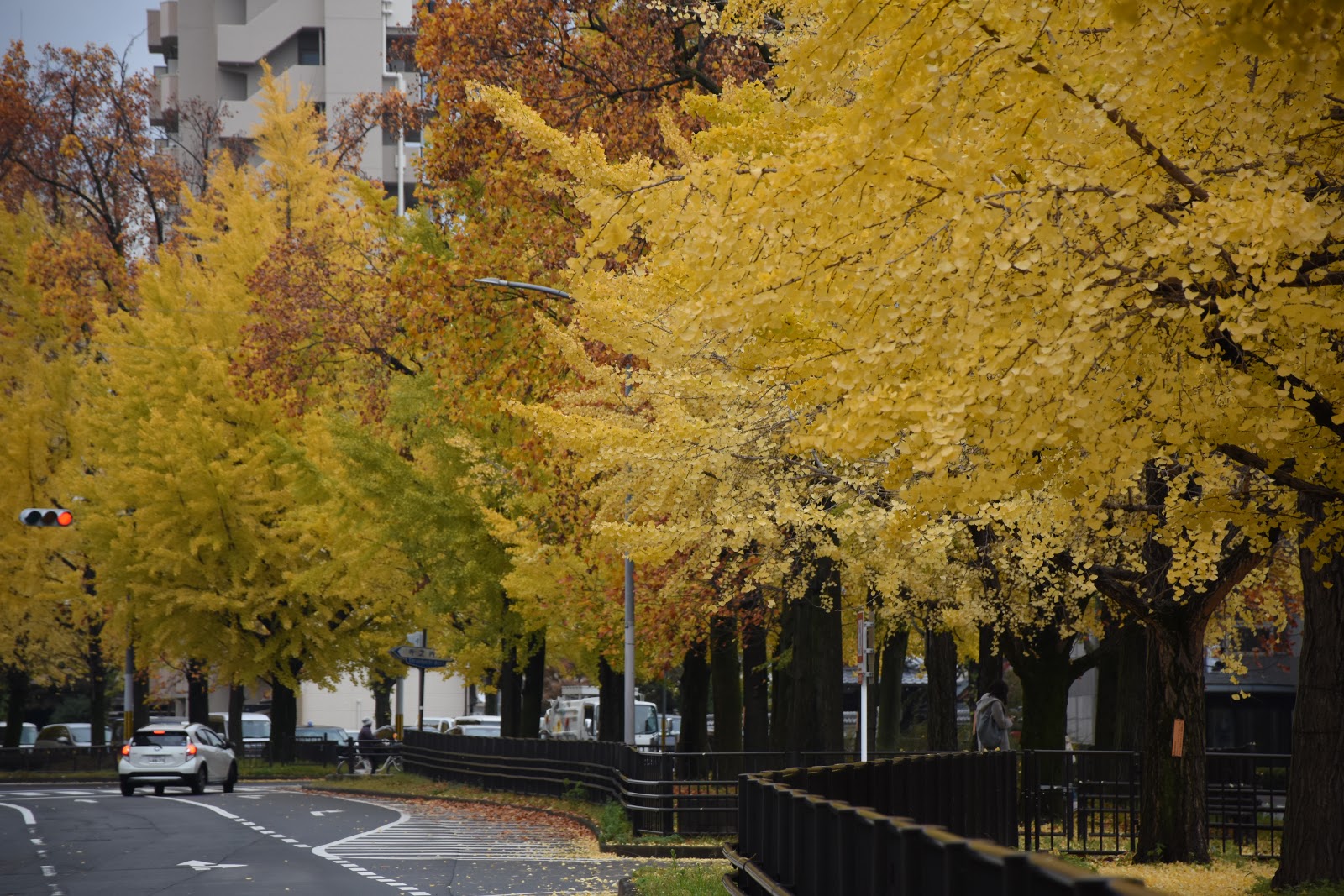 中央分離帯がイチョウ並木の遊歩道になっとる。